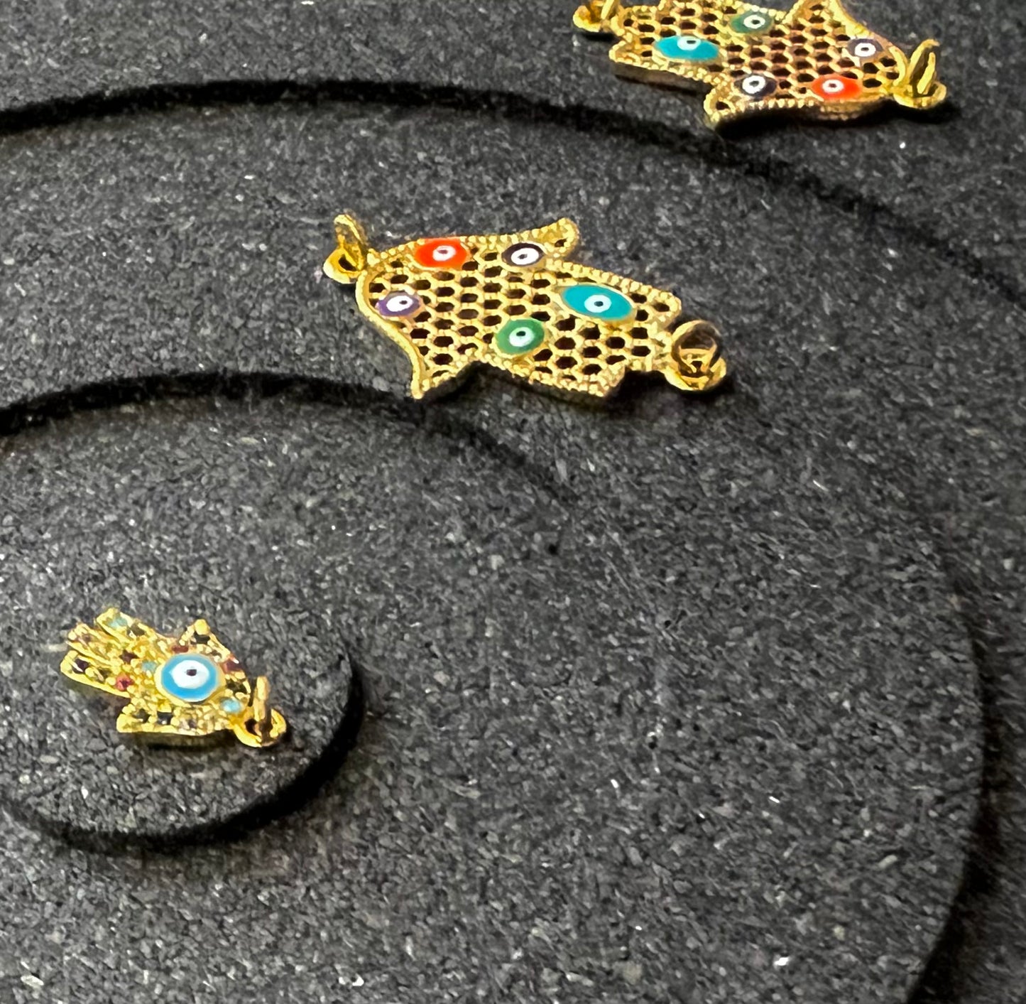 Charms for this piece have been sourced from around the globe - with many special piece coming from England and Israel. Mixed metals, 14k and 22k gold and 925 silver charms are all used in the artwork. This piece also features enamel elements with Evil Eyes that symbolize protection