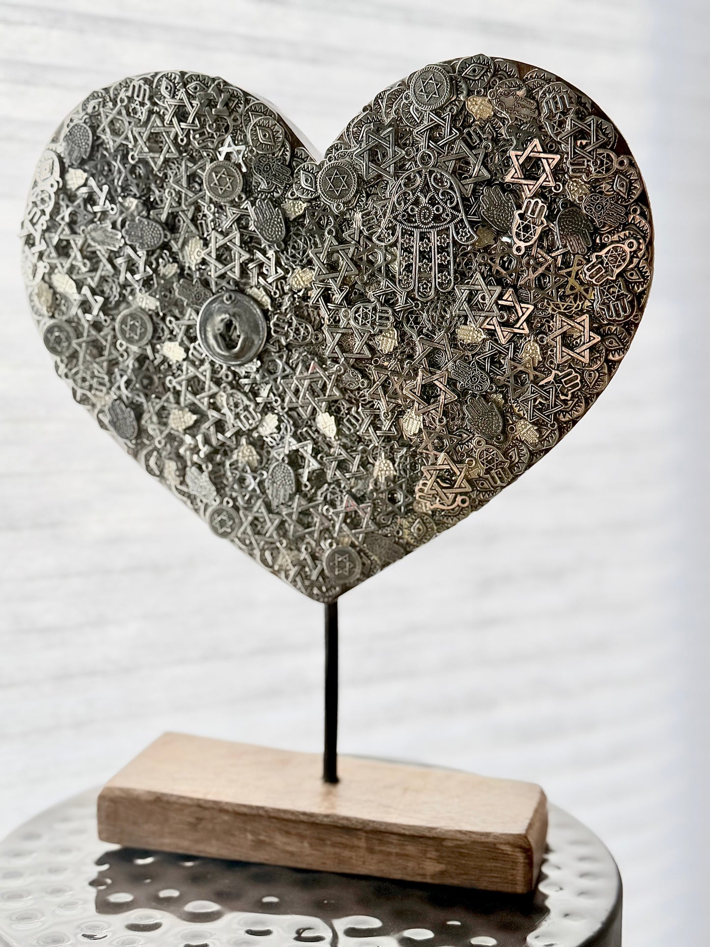 Part of the HAMSA Heart series that explores a passion for Jewish symbolism and culture, this wooden heart sculpture is layered with metal Hamsa, Evil Eye, and Star of David charms (that promote protection and prosperity). All have been sealed in a resin coating.