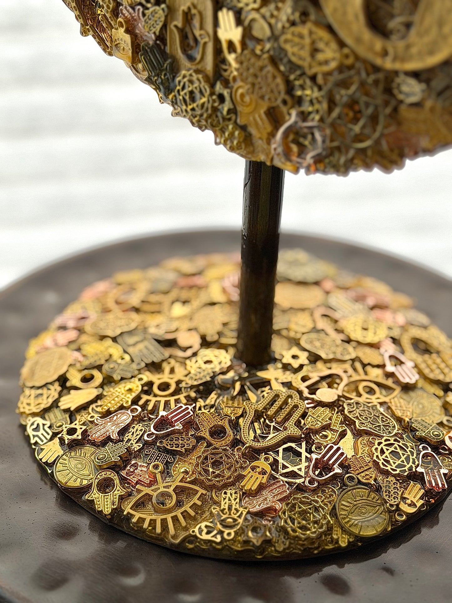 Charms for this piece have been sourced from around the globe - with many special piece coming from England and Israel. Mixed metals, 14k and 22k gold and 925 silver charms are all used in the artwork and protected in a clear resin coating.